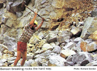 Working only with a small crusher forced him to break bigger rocks by hand for those first five years. Using a 14lb sledgehammer, he hammered 60% of everything that went through the crusher. It was back-breaking and wrist-jarring work. A year ago he bought a bigger crusher that will take rocks the size of a decent office desk, but even with the bigger crusher and other innovations like bringing a drilling rig to the island for a few days to drill dynamite holes in the quarry wall, running the operation is almost too much for him. "Establishing and developing a hardrock quarry is not a job for a one-man-band," he says. "It's been a bloody hard battle: to get where we have got today and we're still not secure here. It's the old story - 16 tons and what do you get, another day older and deeper in debt." Benson tells us about Richard Greaves the part-time building inspector, honeymaker, Pa Beach store-owner and lodge owner. Greaves also runs the Barrier Youth hostel. "The hippies call him Greedy Greaves because he's making a living. He’s going ahead on the island but he works like buggery to do it all. The hippies' attitude is that the bastard is making too much money. "One of Greaves' customers who had already run up an extensive debt asked for further credit. When Greaves turned him down the guy got angry and said Greaves could afford it - after all he had just had an overseas trip. That's their attitude - they're riding on our backs." Benson is obviously bitter about the so-called hippies, no doubt because of the eight court battles he has had with Tim Roberts over his right to run a quarry. The court has limited the hours he can run his big crusher and also instructed him to sound-proof it - a measure he has yet to undertake. Both Benson and Roberts ran for the County Council last October. Benson in the southern riding lost by four votes to Sally Combes while Roberts also dipped out in the central riding. Being a quarrying man, Benson is not adverse to a spot of mining on the island. But he and Mitchell, who also has a mining background, would be in a tiny minority. Nevertheless they argue that mining would benefit the whole island and that the scale would be nothing like the open-cast style in Australia. Gold and silver was discovered in the Okupu and White Cliffs area west of Claris in the 1890s. A number of mines operated there on a small underground scale until just before World War I. An Auckland company, Sigma Resources, (owned by Australia's Delta Gold), has applied for a prospecting licence to go back to the old mines and see if there is anything left in the three vein systems. Each has the potential, according to Sigma's managing director Bruce Bell for gold and silver at a greater depth. "The target up there is for a small to medium-scale conventional underground mine. "Generally people on the island have been helpful to us although the County Council's attitude has been against all mining on the island. But because the land concerned is Crown land, they can't stop mining outright and will have to object in the planning hearings. "There is definitely an aversion within government to large-scale open-pit type mining in New Zealand but there is no question that small underground mines that we are proposing are favoured." Gold and silver occur in conjunction with toxic heavy metals like zinc mercury, arsenic and cadmium. Many of those heavy metals are already found naturally in streams in the White Cliffs area, and residents are careful about which streams they take water from. Wouldn't a mine add to this problem? "I can only point out that we are strictly controlled by regulations," says Bell. "If we set up anything that would cause environmental problems we would be up for the high jump. Then we would have done in our chips for the rest of the country. The burden is on us to perform." Combes rests her hopes with the new Ministry of the Environment. She says they arc keeping a close watch on the Barrier and will help the islanders. "We need to look after the precious resources and channel all development because we have a serious responsibility in managing something that is relatively untouched. We need to manage it so that it doesn't become something that in 20 years time we don't like anymore," she says of both mining and new subdivisions.