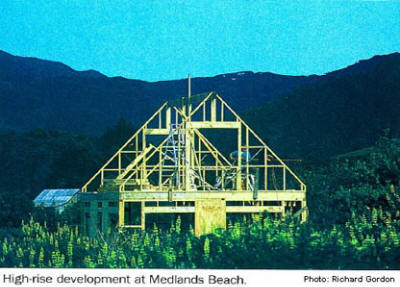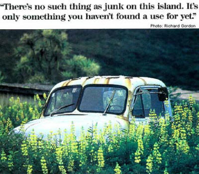 along, a tower of rock stood out, splitting the curv Along the single sand dune running the length of the beach were dotted a few baches, most of them built recently, Some years ago the dune was cut into 144 sections but most of the owners have yet to build. To the south of the beach a sharply jutting headland has been cleared of bush and now grazes sheep. To the west, high mountains covered with dark forest divide the island. Beyond the mountains is a jumble of harbours, bays and inlets, all surrounded by steeply sloping hillsides covered with a thick coating of bush. There the beaches are mainly pebbled, with small scoops of sand. The difference between east and west is symbolic of the contrasts that mark Great Barrier. The conflict between old and new was illustrated when we walked from Medlands Beach over the headland to the settlement at Claris. Rumbling up the narrow steep road behind us was a massive old truck with no top. It looked like a converted vintage fire-engine. We almost expected to see a row of shiny silver helmets along the side seats, but instead it carried a complement of big smiling men wearing full beards and swandris. When the truck finally pulled up outside the Claris store, the driver produced a screwdriver, reached into the dashboard and wound down a screw until the engine died. Back on the Claris/Medlands road we were passed by another truck, this time a bright shiny blue Hino owned by Les Blackwell, a carrier. An elder of the one of the original families on the island, he was on his way to the wharf at Tryphena to meet a navy tug bringing in equipment for the naval station perched on the headland between Awana and Palmers beaches. The new Hino, brought to the island on a roll-on roll-off barge, was a familiar sight on the roads, constantly delivering supplies and dumping gravel on the dusty roads. Blackwell is one of the few residents whose livelihood is dependent on the island's economy - others must rely on their own resources to maintain a reasonable lifestyle. Just a five minute walk from the squeaky-clean Medlands beach is the Rangimarie (Peaceful) farmlet owned by Tim and Robyn Roberts. They live on this small hilly block of land with their two young children as well as Tim's father Jack and Robyn's parents. On their flatland they have developed a large garden and orchard which provides enough food for the family and a small surplus for the guests staying in their four cabins. The income from the cabins is not great - they don't qualify for GST - but is enough to pay for food they can't grow and other essentials. There is no reticulated electricity on Great Barrier. Power for lighting the houses and cabins is generated by a large modern windmill on the hill above the farm. Hot water comes from both solar power and a wetback on the wood-range and the fridges are gas-powered: most people use similar methods, although those without diesel or wind generators either go without light or use tilly lamps. Living on the Barrier is a struggle. Costs are much higher than on the mainland. Freight to Tryphena adds an extra $6 to a sack of flour, and then it has to be transported from the wharf. We sat down one night with the Roberts family to a huge meal of organically grown vegetables and asked them why they bought the farm. "The land was cheap and the farm was ideal for what we wanted to do," said Tim. "The cabins have been here since the farm was settled. We wouldn't want to live here if we didn't have people to stay in them - on an island you can get quite insular and alienated. But we meet more people passing through our guest house than we did running a lunch-bar business in Napier a few years ago. People come to the island to relax, unwind and enjoy themselves. They're more inclined to sit down for a long talk." Our own long talk was cut short by the sudden death of one of the guests. An elderly man had just arrived on the island for a fishing trip with a friend, and his heart gave out after an evening walk. The island's doctor and sole police man were summoned when the body was discovered in the bathroom and came within half an hour. The Barrier isn't a place where you would want to be requiring immediate first-aid. The nearby tall pines, and the kaka parrots in them, seemed to make more noise than usual that night. A day or so later we were driving down Masons Road in the County Council ute with Keith Mitchell horticulturist and part-time handyman for County. Earlier that day the ute's suspension had cracked from the strain either of driving over the uncompromising roads or of collecting tonnes of garbage every day, Japanese vehicles fare the worst on the island - they weren't designed with the Barrier's unsealed roads in mind. As we passed another guest house, Mitchell pointed out a number of wrecked cars left on the side of the road. Dumping cars is a common practice. When a car dies, and they all do, they are left to rot on the spot. On the tops of mountain passes, by sand dunes, in backyards. There are more abandoned cars on Great Barrier than in a South Auckland wreckers' yard.